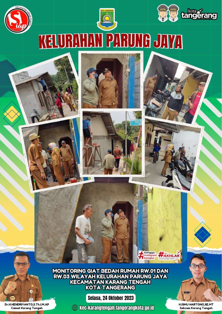 Lurah Parung Jaya bersama Kasi Ekonomi Pembangunan Kecamatan melakukan monitoring kegiatan terkait bedah rumah di lingkungan RW 01 dan RW 03 wilayah Kelurahan Parung Jaya Kecamatan Karang Tengah Kota Tangerang.