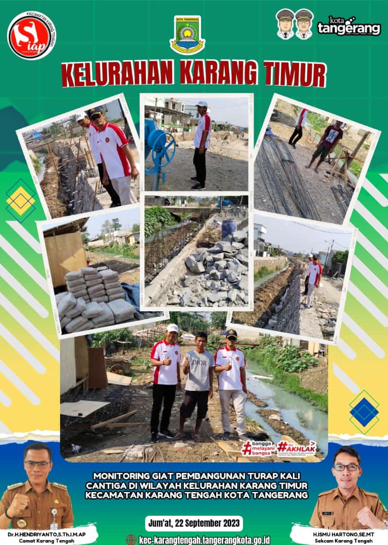 Lurah Karang Timur didampingi Kasi Ekonomi Pembangunan melakukan monitoring kegiatan terkait pembangunan turap kali cantiga serta drainase di lingkungan RT 02 RW 04 wilayah Kelurahan Karang Timur Kecamatan Karang Tengah Kota Tangerang.